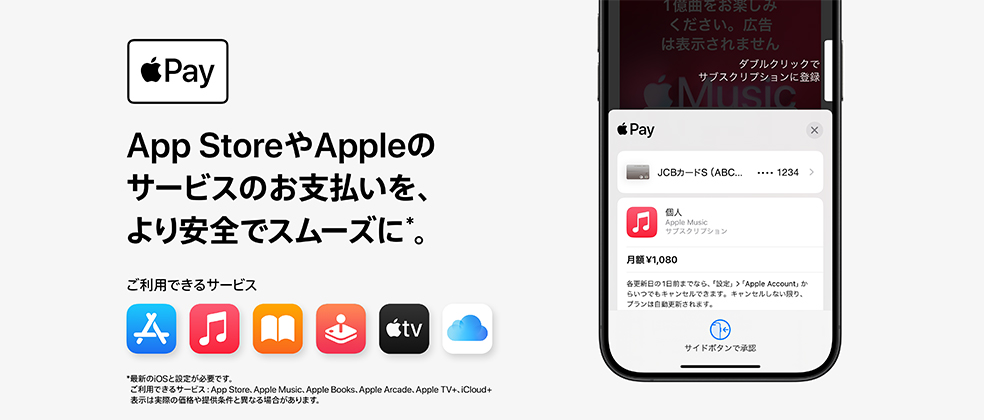 - ※Apple PayをApp StoreやAppleのサービスのお支払い方法として追加するにはiOS 17以降を 搭載したiPhone、またはiPadOS 17以降を搭載したiPadが必要です。